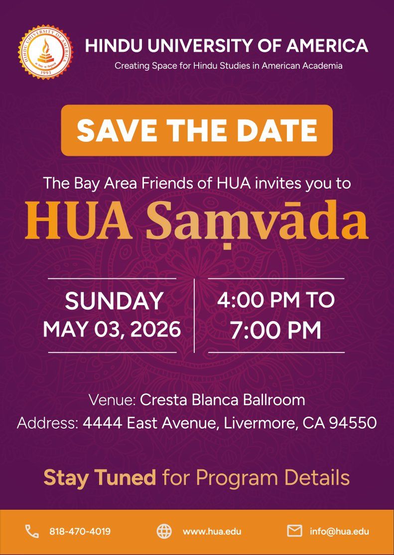 The Bay Area Friends of HUA warmly invites you to HUA Saṃvāda on Sunday, May 03, 2026, for an evening of reflective conversations. This Saṃvāda is not only an opportunity to engage in meaningful dialogue, but also a chance to support Hindu University of America (HUA) with your presence and financial support. Your contribution will help HUA continue to cultivate critical thinking, academic excellence, and authentic voices rooted in the Hindu worldview by equipping scholars to represent dharma in academia, media, and community life.